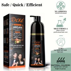 Dexe Hair Dye Shampoo with Natural Argan Oil in Black(420ml), is an innovative product that combines the benefits of hair coloring with the nourishing properties of natural oil. This shampoo allows you to transform your hair color to beautiful black in just 8 minutes, while providing intense hydration with the help of natural Argan oil. The shampoo also deeply nourishes and moisturizes the hair, leaving it soft and shiny. Experience a unique blend of hair coloring and care with Dexe Argan Oil Black Hair Dye Shampoo.